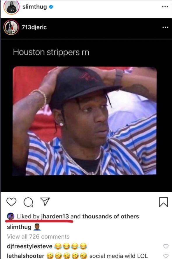 另外哈登本人也在交易后第一时间亮相社媒,休斯顿说唱歌手Slim Thug晒出了一张图片,图片中文字部分是“休斯顿脱衣舞娘”,下方配了休城歌手&火箭球迷Travis Scott“愣住”的表情,意思是“听闻哈登交易后休斯顿舞娘愣住了”!哈登直接点赞了,分手了,看来大家都有点情绪,可以理解!