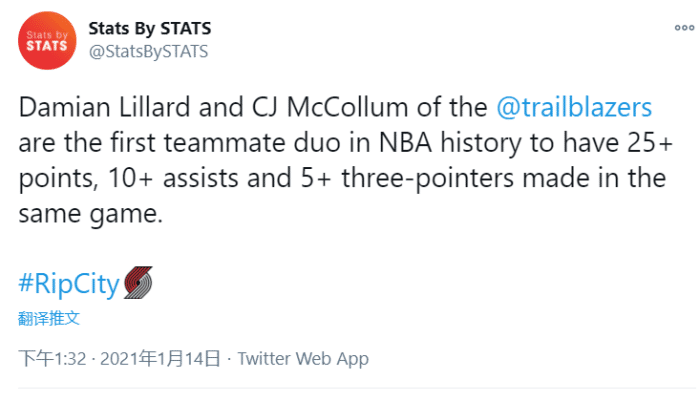 据统计,利拉德和麦科勒姆还是NBA历史首对单场均送出至少25分10助攻5记三分的球员!除此之外,两人也是开拓者队史自1992年以来首对单场同时送出25分+10助攻的组合,上一对是德雷克斯勒和特里波特!