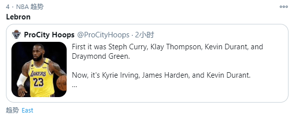 火箭把哈登交易到篮网之后,湖人和詹姆斯登上热搜引热议,美媒热议詹姆斯现在要面对篮网三巨头——杜兰特+哈登+欧文;昔日詹姆斯不仅要面对绿军三巨头,而且曾对阵杜兰特、库里、汤普森和格林的勇士四巨头,上赛季联盟呈现双巨带队的时代,詹姆斯和浓眉带领湖人夺冠。