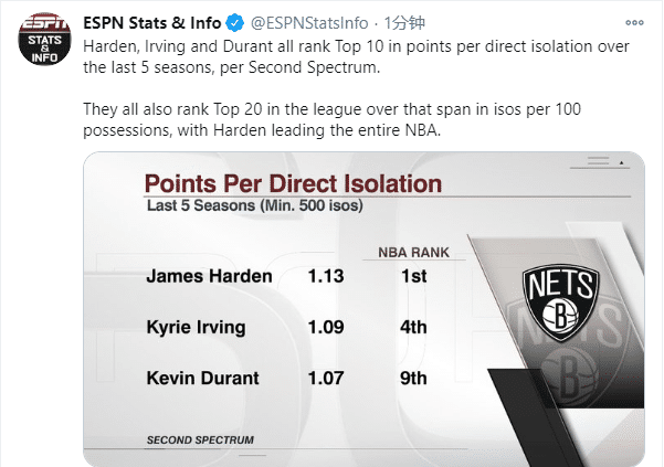 近五个赛季,哈登、杜兰特和欧文的每一次直接得分都排名联盟前十,每百回合进攻得分排名联盟前二十,其中哈登领跑全联盟,难怪开拓者当家球星利拉德感慨篮网队进攻火力十足!