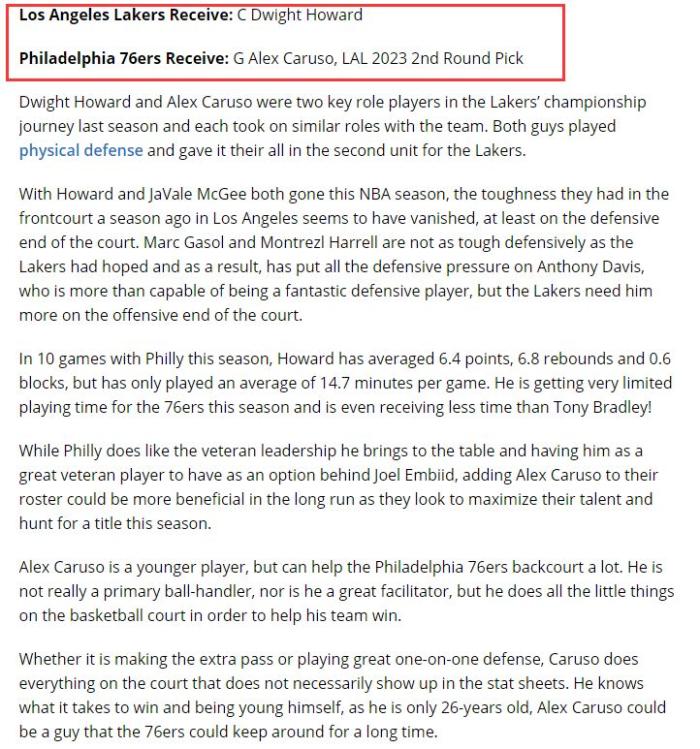 湖人现在的战绩虽然高居联盟榜首,但球迷对此一直感到遗憾,再加上他们本赛季的内线深度薄弱急需补强。于是有美媒建议湖人打包送出卡鲁索和2023年次轮选秀权,从76人换回霍华德。