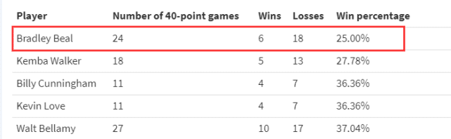 来源:24直播网01-11 21:5024直播网1月11日讯 轰下40+的分数,球队却赢不了球,这显然是一件令人扎心的事。本赛季至今,奇才球星比尔两次得分突破40分,球队却都输了比赛,把上赛季也算上的话,近两年,比尔有12场比赛得分40+,奇才竟然输了其中11场。近日,美媒HoopsHype公布了一份历史球星40+得分的胜率排行榜,比尔排名倒数第一。