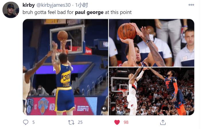 可以看到,有球迷也是第一时间晒出了保罗乔治最近几年惨当各种背景帝的图片!18-19赛季季后赛被利拉德超远三分绝杀,上赛季复赛被德文布克高难度中距离绝杀!不得不说,从NBA近两年来看,泡椒确实算得上是全联盟最惨背景帝,没有之一!
