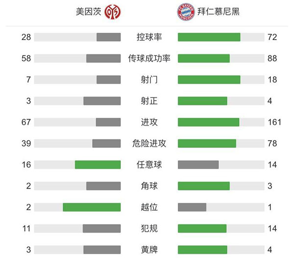 全场比赛结束,拜仁1-2爆冷不敌美因茨,仍领先少赛一场的第二名莱比锡10分。美因茨取胜的同时,暂时高出降级区5分。