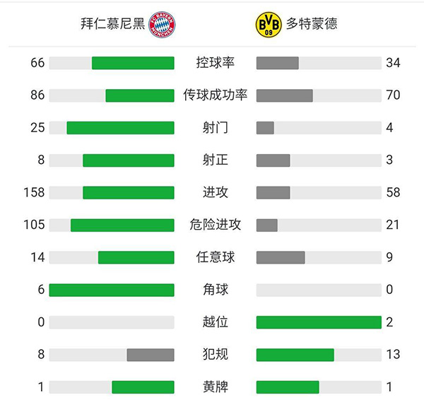 全场比赛结束,拜仁慕尼黑4-2逆转多特蒙德。