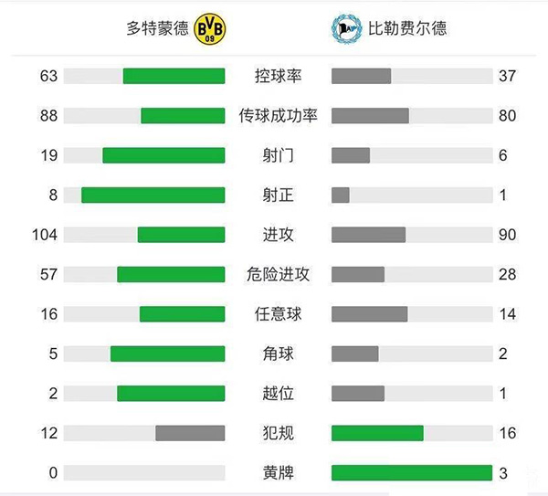 全场比赛结束,多特3-0完胜比勒菲尔德,取得两连胜。