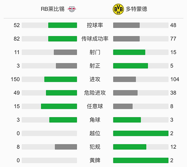 第55分钟,哈兰德带球推进后横传,罗伊斯脚后跟巧妙一磕,桑乔后点推射破门,多特1-0领先RB莱比锡。