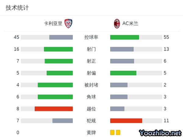 第2分钟,维奥拉主罚角球开出,卢佩托头球一蹭,无人盯防的佐尔泰亚后点凌空抽射弹地入网,卡利亚里1-0AC米兰!