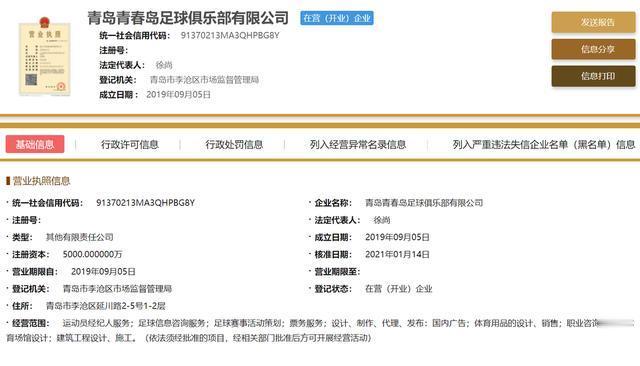 24直播网1月16日讯 据国家企业信用信息公示系统现实,青岛中创恒泰已正式改名为青岛青春岛足球俱乐部有限公司。