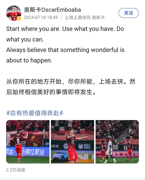 在社交媒体上,奥斯卡写道:从你所在的地方开始,尽你所能,上场去拼,然后始终相信美好的事情即将发生。奥斯卡晒出了自己身穿上海海港的照片,当然这还不是最重要的,最重要的是奥斯卡的IP显示的是上海,显然奥斯卡人还在上海,他并没有返回巴西,而且奥斯卡的话也不难理解,那就是他还在上港的一天就会全力以赴去拼,剩下的事情暂时不去管,因为美好的事情即将发生。