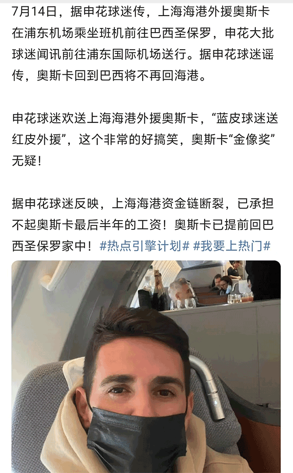 为了让这个爆料穿起来更加有真实性,爆料者还配上了一张奥斯卡在飞机上戴着口罩的照片,似乎想要证明奥斯卡的离开已经实锤了。爆料者对于奥斯卡的爆料还是很有效果的,一时间奥斯卡被拖欠薪水已经离队的传闻也是受到了很多球迷的关注,在这样的情况下,奥斯卡本尊也是现身回应。