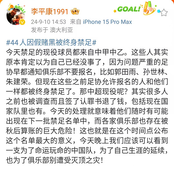 来源:24直播网09-11 13:1724直播网讯 9月10日,在中国国足对阵沙特的世预赛18强赛前,中国足协公布了上一次风暴中的禁足名单,在这一次名单中金敬道等43人被处于了终生禁足的名单,而且让人意外的是在被禁足5年的名单中,球迷看到了5月份接受采访的时候还表示自己不会拿别人钱,因为这不符合自己价值观的汪嵩。