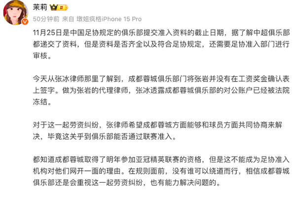 据悉,作为张岩的律师,对这起劳资纠纷,张冰希望成都蓉城方面能够和球员方面共同协商来解决:“相信成都蓉城俱乐部还是会重视这一起劳资纠纷,也有能力解决问题的。”