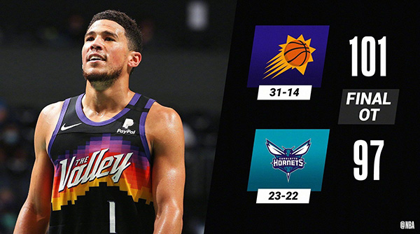 太阳:米卡尔-布里奇斯13分8篮板4助攻6抢断,克劳德2分8篮板4助攻,艾顿14分14篮板,布克35分6篮板3助攻2抢断,保罗16分2篮板1助攻2抢断,克雷格9分4篮板2抢断,萨里奇6分4篮板,佩恩6分2篮板2助攻