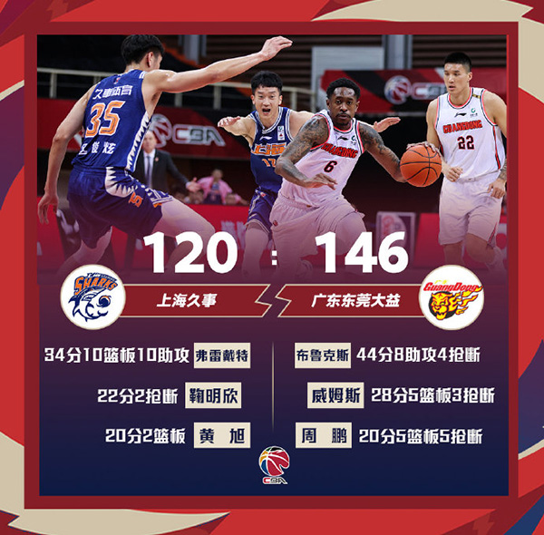 广东(29-4):布鲁克斯44分4篮板8助攻4抢断,威姆斯28分5篮板3助攻3抢断,周鹏20分5篮板2助攻5抢断,胡明轩18分4篮板3助攻,苏伟5分4篮板,曾繁日7分9篮板,王薪凯6分3抢断。