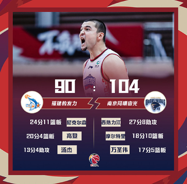 福建:于长春8分3篮板3抢断,高登20分4篮板4助攻,刘洺宇12分3篮板,黄毅超7分7篮板2助攻3抢断,尼克尔森24分11篮板,汤杰13分4助攻2抢断,胡珑贸4分2篮板,李英博2分2篮板