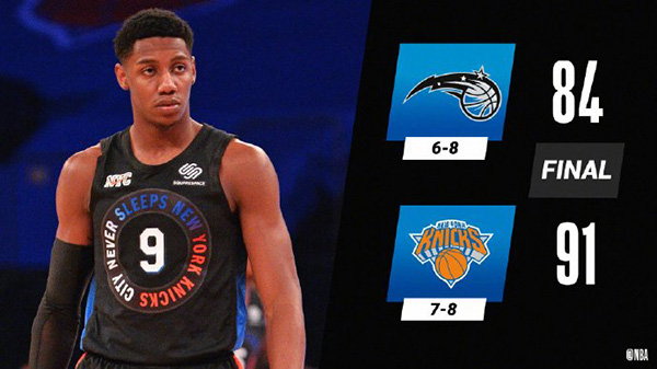 24直播网1月19日讯 NBA常规赛,尼克斯在主场迎战魔术。首节比赛,魔术全队只有两人有得分进账,以13-19落后。之后的时间,尼克斯最多时曾将分差拉大到15分,魔术末节发力追分,在泰伦斯-罗斯命中神仙三分后完成反超。关键时刻,兰德尔、巴雷特和布洛克接连得分,尼克斯轰出一波9-0的小高潮取得8分优势拿下比赛。最终,尼克斯在主场以91-84力克魔术,取得两连胜,送给后者六连败。