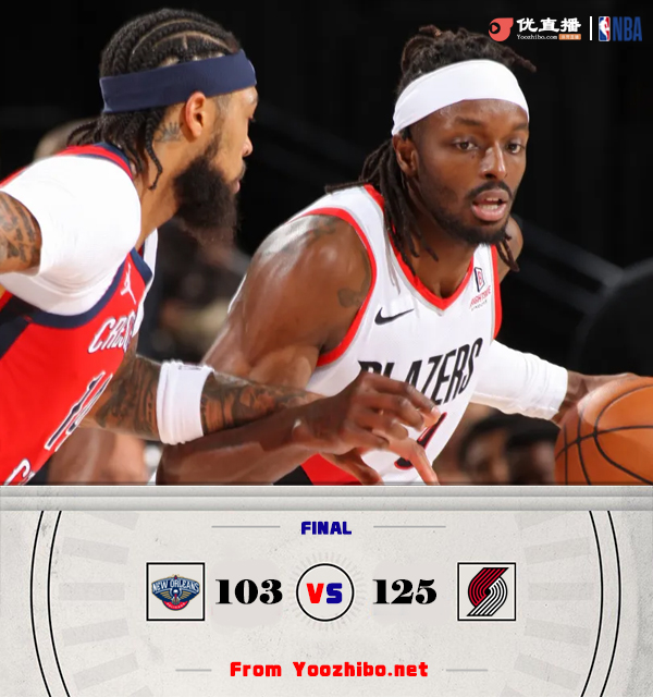 24直播网10月28日讯 NBA常规赛,开拓者主场迎战鹈鹕,目前开拓者0胜2负,鹈鹕则是2胜0负,前天两队刚交手一场,开拓者被鹈鹕逆转。比赛开始,莺歌联手麦科勒姆反客为主先打出8-0开局,随后开拓者接连外线三分追平比分,艾顿里补外投带队回应10-0建立主动权,霍金斯连得6分止血,首节鹈鹕仅落后1分,次节克林根成为奇兵,攻防两端连续立功,加上外线三分,开拓者一波小高潮重新领先到双位数,半场开拓者领先12分。下半场,开拓者接连抢到前场篮板拿到二次进攻机会,一波9-0直接拉开20分以上领先,鹈鹕三分回暖追分,三节开拓者依然领先16分,末节格兰特接连突破2+1连砍8分带队重新拉开20分以上领先,随后鹈鹕多次追分未果,最终开拓者125-103大胜鹈鹕,拿到首胜。