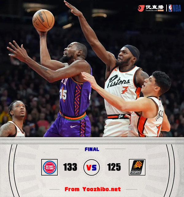24直播网讯 北京时间12月22日讯 NBA常规赛继续开打,太阳坐镇主场迎战活塞,布克本场因为腹股沟伤势缺席比赛。首节之争活塞反客为主打出完美第一节,他们在和对手短暂纠缠后迅速接管比赛,他们先是一波19-4的攻势拉开两位数领先,随后面对太阳回暖的反扑,他们最后又连续三分轰出单节41分并确立15分领先;次节活塞进攻回落而太阳不断蚕食分差,比尔分担了杜兰特身上的压力连续拿分,太阳在第二节追回10分并带着5分劣势进入下半场。第三节太阳进攻端有余防守不足,活塞单节9记三分打得他们毫无办法;末节太阳虽然能够咬住比分但始终无法扭转局势,最后读秒阶段康宁汉姆迎着杜兰特命中三分,随后杜兰特又致命失误无力回天。最终,活塞力克太阳拿下比赛。