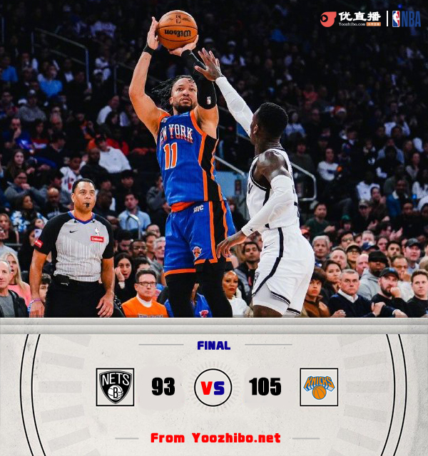 24直播网3月24日讯 NBA常规赛,尼克斯主场迎战篮网。尼克斯东部第五,篮网5连败东部倒数第五。一开场,尼克斯率先发力,连中三分占据主动,篮网不断冲击内线拿分迅速反超,此后双方陷入缠斗,比分交替领先,迪文岑佐连得5分,布里奇斯超远压哨三分帮助篮网57-56领先结束上半场。第三节,两队依旧打得难解难分,比分交替领先,尼克斯一波9-0占据主动,末节迪文岑佐突然发力连得10分带队打出12-0的攻击波确立两位数优势,篮网进攻端哑火,分差越拉越大,最终,尼克斯105-93击败篮网,送给对手6连败。