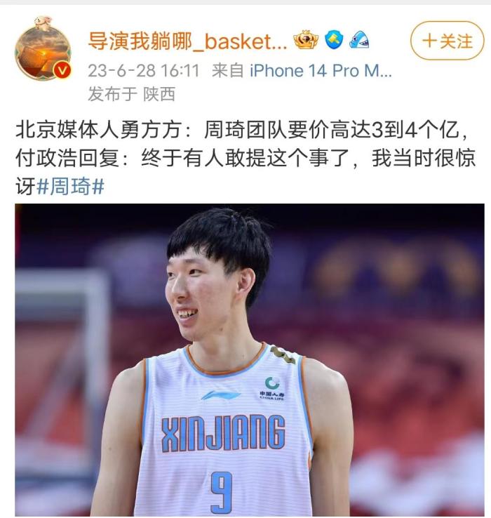 6月28日,名记勇方方在社交媒体上表示:“三到四个小目标,那不是球队要买球员,那是球员把球队盘下来了。”虽然知名篮球媒体人“导演我躺哪CBA”也是爆料表示:根据北京媒体人勇方方爆料:周琦团队要价高达3到4亿,名记付政浩回复:终于有人敢提这个事情了,我当时很惊讶。