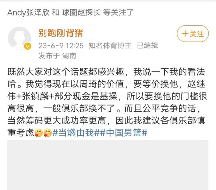 关于周琦的价值,俗话说外行看热闹,内行看门道,著名的篮球媒体人“别跑刚被猪”也是回应了这个问题。“别跑刚被猪”表示:既然大家对这个话题感兴趣,我说一下我的看法,我觉得以周琦现在的价值,想要等价交换,赵继伟+张镇麟+部分现金是基操,所以要换他的门槛很高,一般俱乐部换不了,而且公平竞振的话,当然筹码更大成功率更高,因为我建议各俱乐部慎重考虑。