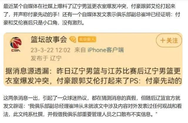 接下来,我们再来说说郭艾伦这边,在此前多个辽宁篮球媒体人爆料付豪和郭艾伦在更衣室打架,随后俱乐部也是辟谣了所谓的副总爆料,但是对于两者的冲突是否存在并没有回应。