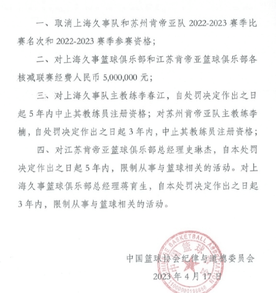 来源:24直播网04-17 16:1224直播网04月17日中国篮协公布了重磅罚单,针对季后赛12进8系列赛G3,上海男篮击败江苏男篮最后两分钟的戏剧性,被证实双方消极比赛,两队各被罚款500万,李春江禁赛5年,李楠禁赛3年。上海和江苏男篮的总经理蒋育生和史琳杰限制3年、5年内无法从事篮球相关活动。