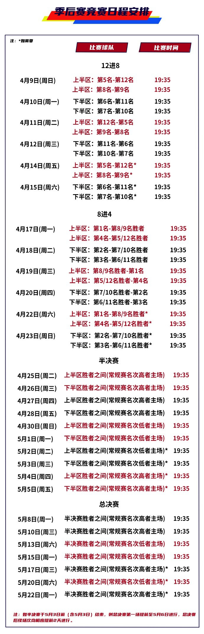 22-23赛季CBA季后赛赛程安排详细时间表如下图: