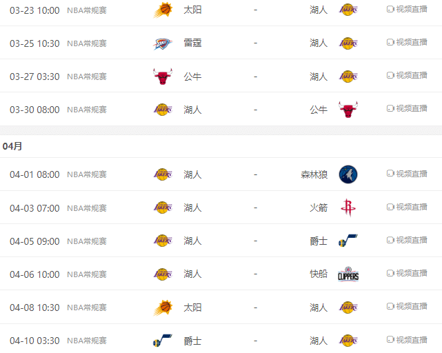 湖人的战绩为35胜37负,常规赛打了72轮,还剩下10场比赛,这10场比赛结束之后,湖人能否参加附加赛,甚至是他们期待的西部前六就有了最终的归属。接下来湖人的10场比赛对手是:三连主场迎战太阳、雷霆和公牛。五连客大战公牛、森林狼、火箭、爵士和快船。最后的两场比赛都是主场,对手是太阳和爵士。