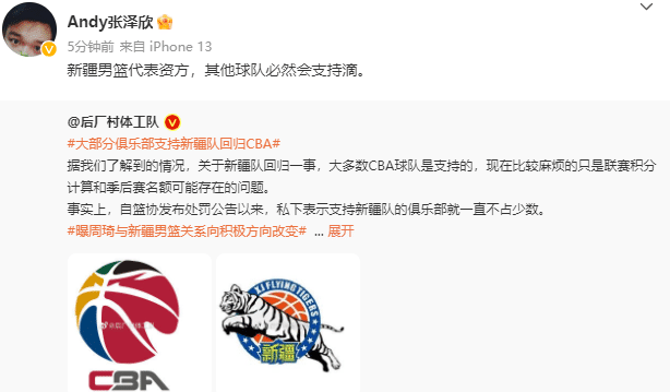 名记张泽欣表示:新疆男篮代表资方,其他球队必然会支持滴。