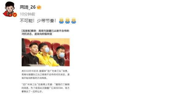 同时还有消息称周琦和新疆男篮的关系改善,针对传闻在,周琦直接在社交媒体上转发进行辟谣,称:“不可能!少带节奏!”