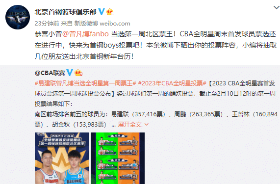 北京首钢也送上了祝福,同时疯狂给曾凡博拉票,称:“恭喜小曾曾凡博当选第一周北区票王!CBA全明星周末首发球员票选还在进行中,快来为首钢boys投票吧!”