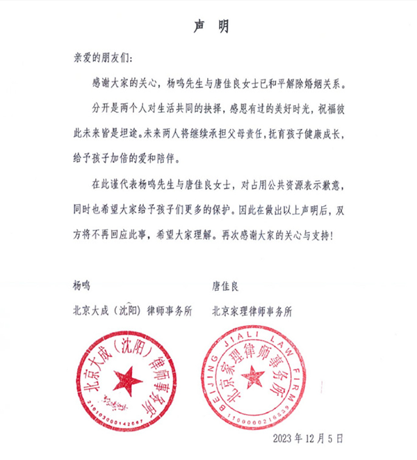 同时杨鸣和唐佳良还会对簿公堂,两人针对离婚的纠纷、孩子的抚养,时间是12月12日,外界的关注度很高。