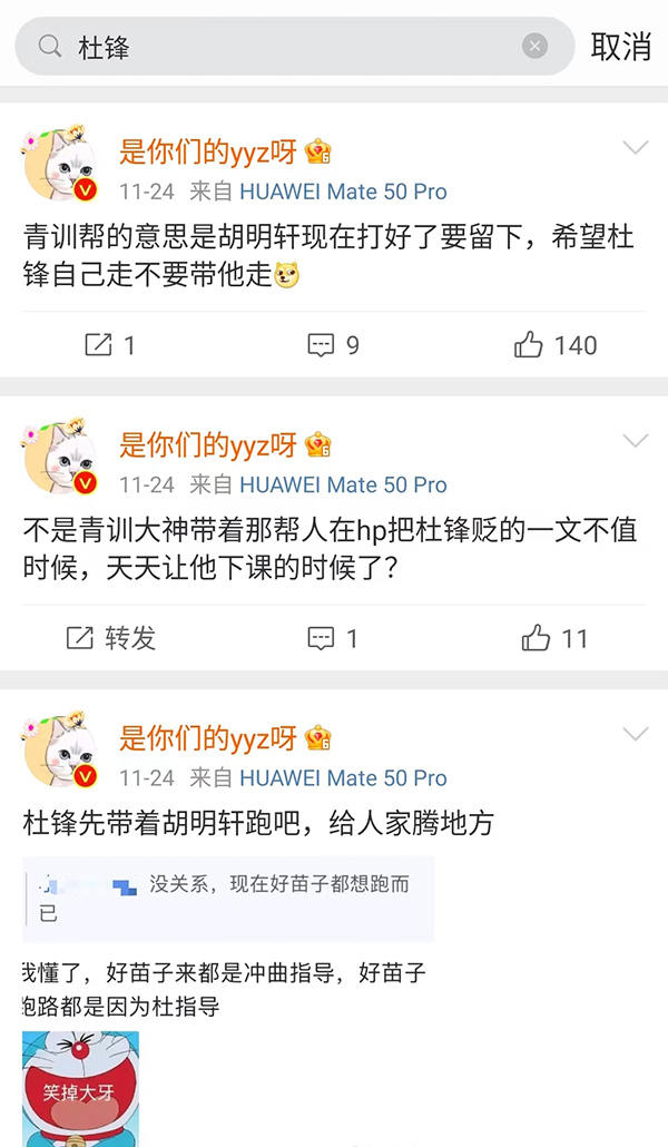 为什么这样说呢?近期,广东男篮培养出的刘朕赫想要离队寻求自己的发展,再加上网络上传出广东男篮梯队的教练和球员别与想法。比如说,知名的广东篮球媒体人“是你们的YYZ呀”也是接连更新社交媒体为杜锋指导鸣不平,甚至该媒体人喊话“杜锋,走吧,宏远球迷喂不熟”、“黄明依也是二队不要杜锋要的,一起带走”“杜锋,赶紧走吧,去哪儿都比在广东好”,该媒体人也是强调:‘我觉饿得杜锋最大的失败就是看人能力很差,费尽心力培养出的人真回报他的没几个,人家只记住你怎么骂我,从来不想为什么骂他。’从该媒体人的爆料来看,杜锋的处境或许没有想象中的乐观,特别是当某网红教练开始有想法的时候,杜锋指导很有可能离任广东男篮。