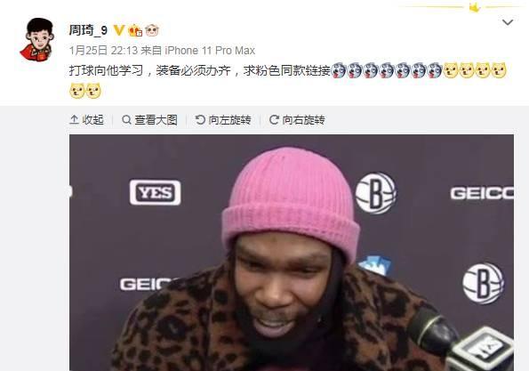 周琦因伤缺阵比赛,新疆也以93:101输给了对手,但是赛后心情还不错。赛后他晒出了杜兰特采访时的装扮附文“打球向他学习,装备必须办齐,求粉色同款链接。”然后与队友曾令旭互动(能了解这个帽子可能是老曾的)还与昨日砍下29分的原帅互动!