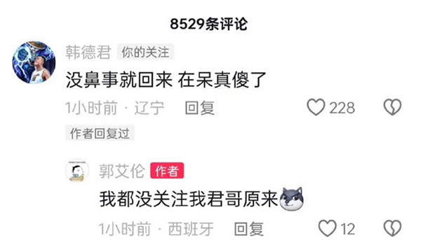 在西班牙期间,郭艾伦在社交媒体上非常活跃,包括给患病儿童捐钱,向贾跃亭索要150万元的欠款等等。辽篮全队也都很想念郭艾伦,希望他回来,也就有了韩德君在社交媒体上希望郭艾伦尽快回来。
