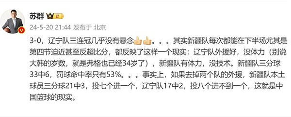 比赛结束之后,名嘴苏群解读比赛的时候谈到去掉外援的数据,称:如果去掉两个队的外援,新疆队本土球员三分球21中3,投七个进一个,辽宁队17中2,投八个进不到一个,这就是中国篮球的现实。