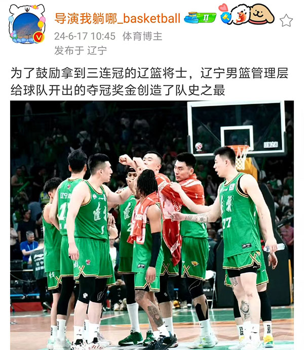 接下来,我们再来说说辽宁男篮夺冠奖金的事情,在辽宁男篮夺冠后,关于辽宁男篮夺冠奖金的话题就没有消停过,有的说这个钱至少4000万,有的说辽宁男篮三连冠不得奖励个小目标,而在近期,这个事情终于有了答案。
