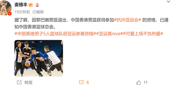这是根据媒体人麦穗丰的报道显示:“据了解,因黎巴嫩男篮退出,中国香港男篮获得参加杭州亚运会的资格,已通知中国香港篮球总会。”
