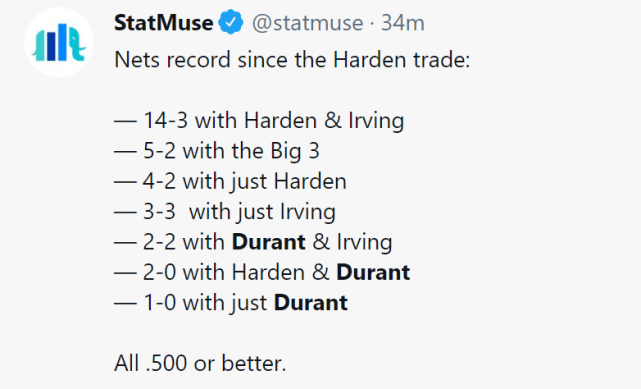 数据网站StatMuse晒出了哈登交易后,篮网战绩的分布情况—
