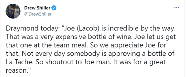 来源:24直播网04-15 16:3224直播网4月15日讯 一天前,格林和库里一起吃饭的照片火了!原因很简单,他们在用餐时所喝的那瓶红酒价值5万美元。不少球迷称赞库里豪横,请队友喝这么贵的酒。北京时间4月14日,格林接受采访时透露,那瓶酒其实是勇士老板拉科布送给他俩的。