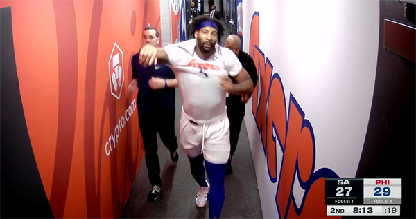上半场最后3分钟,恩比德突破撞倒文班亚马吃到技术犯规,随后恩比德十分生气,暴怒并且怒喷裁判从而吃到技术犯规,之后恩比德更加生气,再次吃T,连吃两T被驱逐离场。
