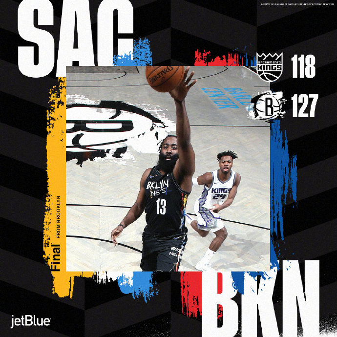 篮网(21-12):哈登29分11篮板43助攻,欧文21分5篮板7助攻3抢断,哈里斯18分4篮板,布朗29分4篮板2助攻,小乔丹10分8篮板4封盖,约翰逊7分3篮板3助攻。