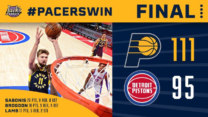 步行者(13-13):萨博尼斯26分8板8助、布罗格登18分9板4助、麦克德莫特9分、贾斯汀-霍勒迪11分。