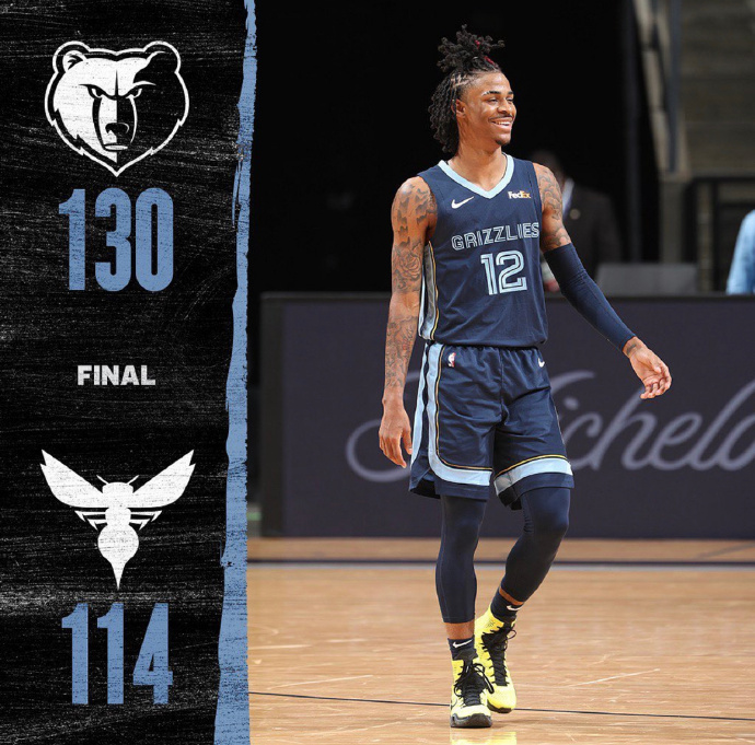 灰熊(10-10):莫兰特15分3篮板11助攻、安德森27分2篮板3助攻、格雷森-阿伦18分3篮板、泰厄斯-琼斯12分3篮板3助攻、布鲁克斯20分2篮板4助攻、贝恩18分2助攻、瓦兰丘纳斯12分15篮板