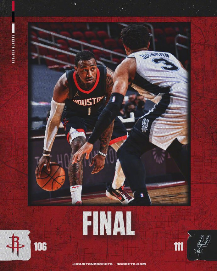 24直播网2月7日讯 NBA常规赛火箭主场对阵马刺,本场比赛阿尔德里奇和沃克都不出战,伍德也因伤缺阵。开场后马刺率先打出攻势取得领先,考辛斯和戈登接连射中三分咬住比分,第二节两队手感都比较一般,盖伊在外线三分手感不错,不过沃尔和考辛斯为火箭追分,上半场马刺51-47领先4分。下半场回来场上局势仍旧胶着,两队手感恢复不断拿分,第四节火箭一度完成反超,不过马刺最后关头顶住压力拿下比赛胜利,最终马刺111-106险胜火箭。