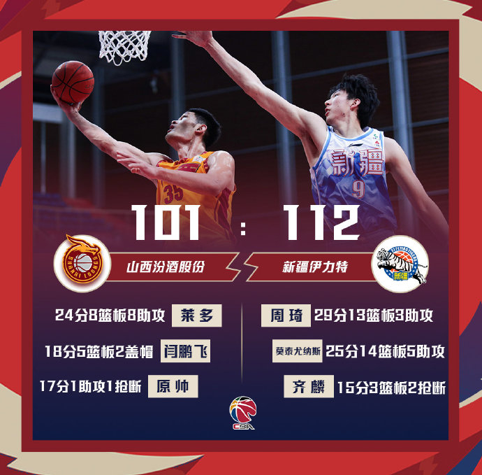 24直播网2月1日讯 CBA常规赛山西主场对阵新疆,山西最近状态低迷遭遇6连败。开场后不久新疆就打出一波11-0取得领先。第二节两队进攻状态都不错,莱多接连砍分帮助山西追上比分,不过新疆依靠周琦和莫泰两人在内线的发挥保持略微领先,上半场新疆51-50领先1分。下半场新疆再次巩固领先优势,不过山西仍旧紧追不舍,但新疆始终守住领先优势,最终新疆112-101送给山西7连败。