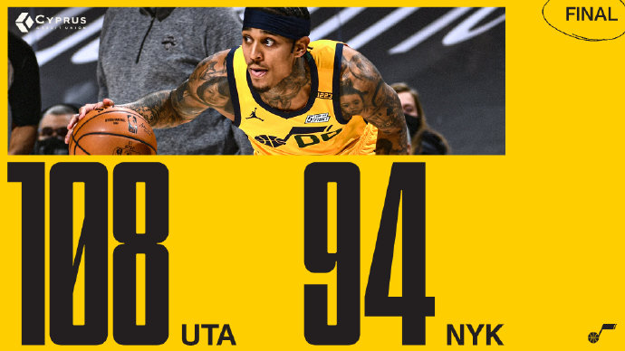 24直播网1月27日讯 爵士坐镇主场迎战尼克斯,上半场尼克斯杀出奇兵,替补上场的小里弗斯里突外投独砍25分,率领尼克斯在半场战罢以59-46建立起两位数领先。易边再战,爵士找到手感,康利、博格丹诺维奇和米切尔等连中三分,爵士凭借这波三分雨抹掉分差。末节爵士延续手感火热手感,奥尼尔等连续得分,帮助球队反超比分。而尼克斯则命中率暴跌,整个下半场仅得到35分。最终,爵士以108-94逆转尼克斯,豪取9连胜,同时送给尼克斯3连败