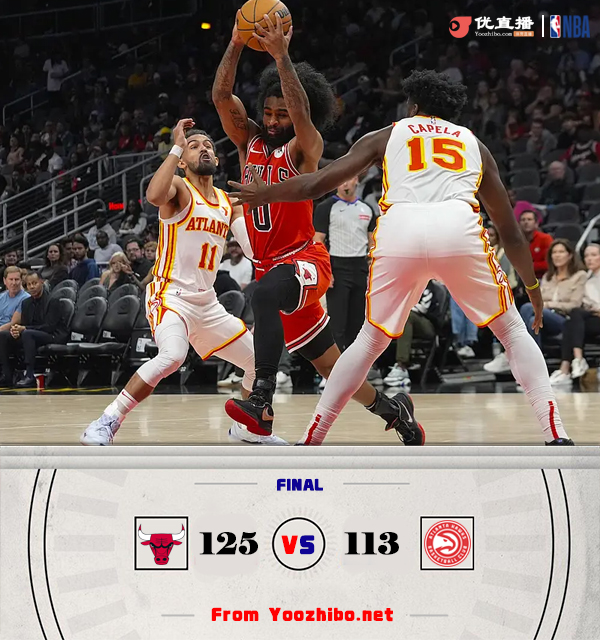 24直播网11月10日讯 NBA常规赛,公牛对阵老鹰,公牛最近遭遇4连败,老鹰上场比赛惜败活塞。开场后老鹰在特雷-杨的带领下首先打出攻势,特雷-杨自己出手不多但连连为队友送出精彩助攻,卡佩拉在内线也是表现相当活跃,公牛主要依靠拉文和武切维奇的单打追分。第二节回来两队手感都不错,连续在外线对飚三分,公牛虽然多点开花,但老鹰进攻也相当犀利没有给公牛缩小分差的机会,其中杰伦-约翰逊状态火热频频砍分。易边再战,老鹰延续状态以7-0开局,公牛经过暂停调整连续用三分稳住阵脚,第四节上来老鹰进攻断电,公牛趁势追击一波14-3的反扑完成反超,特雷-杨和杰伦-约翰逊凭借个人能力进攻也未能奏效,反倒是拉文和怀特关键时刻表现硬气先后拿分帮助公牛锁定胜局,最终公牛125-113逆转老鹰结束4连败,老鹰遭遇2连败。